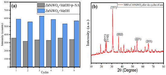 (a) Reusability test for ZnNiWO4 towards p-NA sensing. (b) XRD of ZnNiWO4 after six cycles of use.