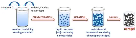 Aerogels have been defined as solid colloidal or polymeric networks expanded throughout their entire volume by a gas [,]. In practice, aerogels are nanostructured, ultra-lightweight materials [], consisting mostly of empty space (>80% v/v). They are prepared via sol–gel processes that yield gels, which are subsequently dried by turning the pore-filling solvent into a supercritical fluid and releasing it as a gas (Figure 1). The specific drying process is the key to avoiding significant volume reduction or network compaction during the transition from gels to aerogels, and therefore, is still the most widely used, although in some cases, materials with aerogel properties have been obtained after sub-critical drying, freeze-drying (cryogels), or even drying under ambient conditions [].