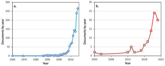 The number of publications on aerogels for environmental applications (a) and aerogels for uranium uptake and recovery (b). Source: Scopus (1 December 2022).