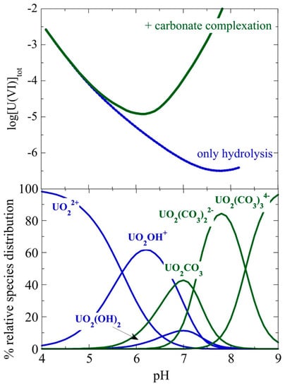 Uranium in nature can exist in five different oxidation states from +2 to +6. However, +4 and +6 are the most abundant oxidation states, and +6 is the predominant oxidation state in aqueous solutions under ambient conditions. In hexavalent oxidation, state uranium exists in the form of the uranyl cation (UO22+) and is easily hydrolyzed (pH > 4) in aqueous solutions. The formation of the polynuclear species is favored at an increased U(VI) concentration (>10–5 M). Moreover, under ambient conditions and in the presence of carbonate cations, the U(VI)-carbonato species govern the U(VI) chemistry in aqueous solutions and in the near neutral and alkaline pH region [,,]. Figure 3 shows the solubility curve of UO2(OH)2, which is the solubility limiting solid phase of U(VI) under ambient conditions in aqueous solutions and the corresponding species distribution diagram, which includes only mononuclear U(VI) species. In order to denote the impact of carbonate complexation, Figure 3 also includes the solubility curve of UO2(OH)2 assuming only hydrolysis. The calculation of both the solubility curves and the species distribution has been performed using the solubility product of UO2(OH)2 and the formation constants of the hydrolysis species and the carbonate complexes that are available in the literature [,].