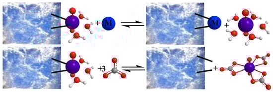 On the other hand, among the studied anions (Figure 4), only the presence of CO32– and PO42– in the solution seemed to significantly reduce the relative U(VI) removal, because both CO32– and PO42– form very stable complexes with UO22+ (e.g., UO2CO3, UO2(CO3)22−, UO2PO4−, UO2HPO4), which govern the U(VI) chemistry in the system [,,]. The competitive interaction between the U(VI) and carbonate cations to form the U(VI)-tricarbonato complex, which stabilizes U(VI) in aqueous solutions, is schematically shown in Figure 5 (bottom).