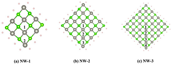 Bulk ZnSe presents a cubic zinc-blende structure at low temperatures. During the doping and nanocrystallization process, this zinc-blende-structure can be retained. Many similar experiments have been reported. Here, sphalerite ZnSe NWs, alone [001] and with a square cross-section of a different diameter, were considered in this study: NW-1(8.5 Å), NW-2(14.2 Å), NW-3(19.8 Å), as shown in Figure 1. The ZnSe NWs models were designed by cutting out a fragment of 7 × 7 × 1 bulk ZnSe crystals. A 20 Å vacuum space was constructed to minimize the artificial interaction between neighboring NWs due to the periodic boundary conditions. The NWs’ surface Zn and Se bonds were saturated with H1.5 and H0.5 [23]. The Cr2+:ZnSe NWs were structured by replacing a Zn atom with a Cr atom in the unit cell of the pristine NWs models, resulting in Cr2+ concentrations of 12.5%, 5.6% and 3.1%, respectively. The chemical formulas for NW-1, NW-2 and NW-3 are H16Cr1Zn7Se8, H24Cr1Zn17Se18 and H32Cr1Zn31Se32, respectively. In each ZnSe NW with different diameters, we chose nonequivalent Zn positions from the center to surface, labeled as 1, 2, 3, 4 (as shown in Figure 1), to study the effect of different doping sites. Thus, we obtained nine models: NW-1(site 1), NW-1(site 2), NW-2(site 1), NW-2(site 2), NW-2(site 3), NW-3(site 1), NW-3(site 2), NW-3(site 3), NW-3(site 4).
