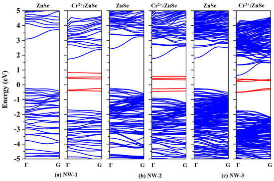 Figure 2. The band structure of ZnSe and Cr2+:ZnSe NWs in different sizes. The lines in blue present the intrinsic bands of ZnSe NWs, and the red lines present the impurity bands introduced by Cr atom doping.