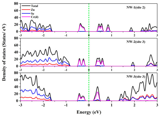 DOS is considered having a better understanding about the electronic behavior of the doping system. As can be observed from Figure 3, the impurity bands emerge in the bandgap are mainly composed of Cr(d) orbital electrons. The impurity bands span the Fermi level and are divided into electronically occupied bands and empty bands. The energy difference between the electron-occupied bands and empty bands increases with the decrease in NWs diameter, and is larger than the bulk Cr2+:ZnSe [32].