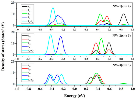 To further analyze the splitting characteristics of the impurity orbitals, the partial density of state (PDOS) of Cr(d) orbitals is calculated and shown in Figure 4. The Cr(d) orbitals are classified into triply degenerated t 2 orbitals ( d x y , d y z , d z x ) and doubly degenerated e orbitals ( d x 2 y 2 , d z 2 ), which lie above and below the Fermi level, the same as in the bulk case. With the decrease in Cr2+:ZnSe NWs diameter, the positions of the electron-occupied orbitals did not significantly change, but the electron-unoccupied orbitals moved in the high-energy direction, resulting in an increase in the splitting energy between e and t 2 orbitals.