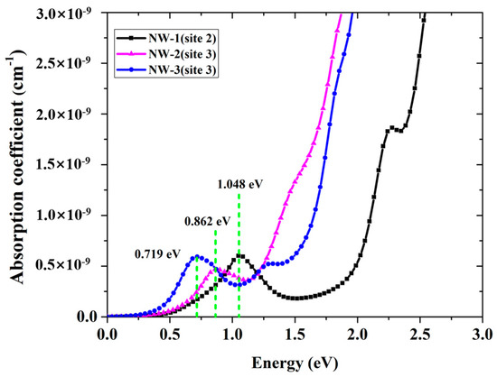 Figure 6 shows the absorption spectrum of Cr2+:ZnSe NWs of different sizes, especially for the infrared range. Absorption peaks at 1.048 eV (1184 nm), 0.862 eV (1440 nm) and 0.719 eV (1726 nm) for NW-1, NW-2, NW-3 are observed, exhibiting a significant blue shift as the NWs diameter decreases. In addition, the absorption of the NWs with the same Cr2+ concentration also moved to a shorter wavelength compared to the bulk Cr2+:ZnSe [33]. We believe that these absorptions are related to the electron intra-band transitions between the splitting energy level of Cr(d) e and t 2 orbital. Related mid-infrared luminescence would be generated under corresponding excitation and blue-shifted, which can be verified by our experimental results [35]. The results demonstrate that nano-crystallization is an efficient way to realize the wavelength turnability of laser crystals.