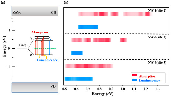 Figure 7. The absorption and luminescence calculation scheme (a) and numerical statistics of Cr(d) electrons transition energy density distribution of Cr2+:ZnSe NWs (b).