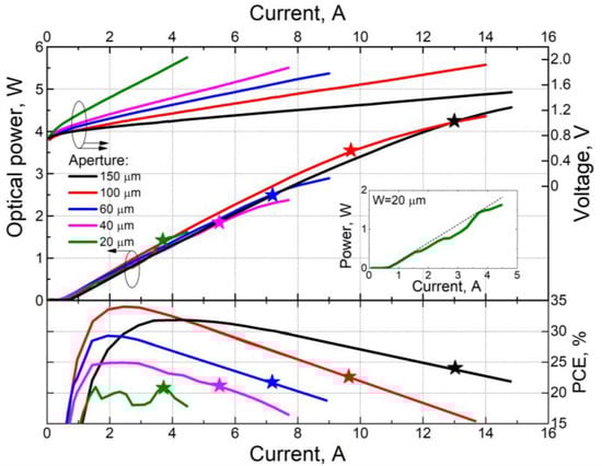 For most applications, high-power diode lasers are of greatest interest. First of all, the laser power is determined by the heterostructure design. Recent studies have shown that lasers based on InGaAs/AlGaInAs/InP heterostructures with ultra-narrow waveguides have a higher optical power [1]. By using the ultra-narrow waveguide design, the heat sinking from the active region can be improved; internal optical loss, and series and thermal resistances can be reduced; and as a result it becomes possible to maintain the linearity of the L-I curve up to higher pump currents. Nevertheless, the diode laser maximum power is limited by internal physical phenomena and processes [2,3]. Therefore, a further power increase for lasers of this design is possible due to stripe contact (aperture) widening, which can be seen from Equation (1):