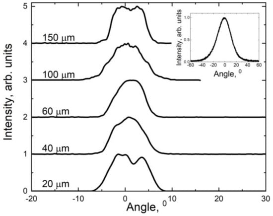 The lateral and vertical far fields were measured for the samples. All lasers are made from the same wafer, so they have the same vertical far-field intensity distribution, which corresponds to the electromagnetic wave field profile in the waveguide. All lasers operate in the fundamental mode in the vertical direction under all pump currents. The inset of Figure 5 shows a typical far field. The laser beam divergence was defined as full-width at half-maximum (FWHM). The vertical FWHM is about 26–30°. Figure 5 shows typical lateral far fields. The emission is multimode in the lateral direction. The lateral FWHM is in the range of 6–10°. The lateral beam divergences at the 1/e2 level are presented in Table 1.