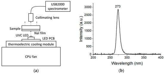 The NaI powder and sample XRD patterns were obtained using an X-ray diffractometer Rigaku Multiflex (Rigaku Co., Spring, TX, USA). The luminescence properties were investigated by using a homemade system mainly consisting of a UVC LED (LG Innotek Co., Jung-gu, Seoul, Republic of Korea) and a spectrometer (USB2000, Ocean Optics, Inc., Largo, FL, USA), as illustrated in Figure 1a. Figure 1b shows the spectrum of this light source, indicating a maximum emission intensity of about 273 nm and its FWHM of 12.0 nm. Driven by a forward voltage of 8 VDC, the LED source could provide a flux of 10 mW. Moreover, to maintain its working temperature below 60 °C, it was cooled via a thermoelectric cooling module equipped with a CPU fan. The photoluminescence light emitted by the Cs-doped NaI samples was collected by a UV collimator lens, and the spectrum ranging from 200 to 850 nm was analyzed using the spectrometer USB2000 (Ocean Optics, Inc., Largo, FL, USA).