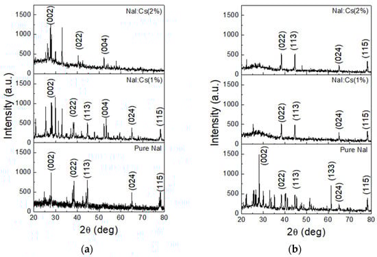 Figure 6a shows the NaI:Cs(1%) sample has the higher luminescent intensity because Cs dopants can fill the detects, as mentioned above [61]. Additional activator (Cs) excited states and activator ground states may be generated in the band gap, leading to the photon energy transfer from the host NaI to the dopant Cs of the excited state [62]. As previously mentioned, such a process tends to rearrange pure or doped NaI films toward only one or a few crystalline orientations, shown in Figure 4a, in turn enhancing their PL performance compared to those with more orientations.
