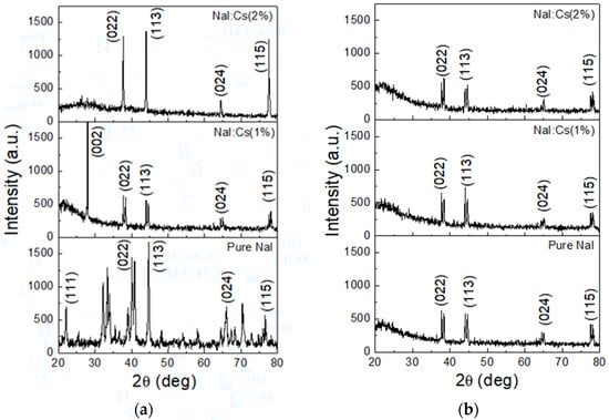 XRD patterns of (a) the as-deposited and (b) the post-annealing undoped NaI, NaI:Cs(1%), and NaI:Cs(2%) films grown on the B270 substrate.