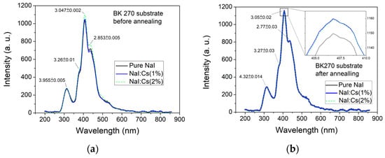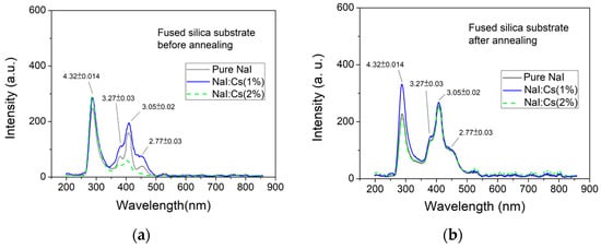 The luminescence efficiencies of pure NaI, NaI:Cs(1%), and NaI:Cs(2%) increase by about 1.7, 1.5, and 4.3 times, respectively, due to the post-annealing process. However, as shown in Figure 7b, the peak intensity of all three post-annealed samples increases to approximately 260 (a.u.), four times smaller than the sample deposited on the B270 glass substrate. In addition, this post-annealing does not affect the 4.32 eV peak intensity.