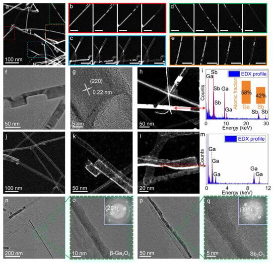 - Kim, H.W.; Kim, N.H. Growth of β-Ga2O3 Nanobelts on Ir-Coated Substrates. Appl. Phys. A Mater. Sci. Process. 2005, 80, 537–540. [Google Scholar] [CrossRef]