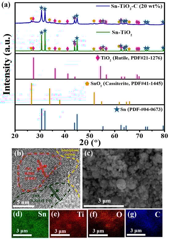 (a) XRD spectra of Sn-TiO2-C (20 wt%) and Sn-TiO2 along with theoretical peaks of TiO2 (rutile, PDF# 21-1276), SnO2 (cassiterite, PDF# 41-1445), and Sn (PDF# 04-0673). (b) HRTEM and (c) SEM images of Sn-TiO2-C (20 wt%). (d–g) EDS element maps of Sn-TiO2-C (20 wt%) for Sn, Ti, C, and O.