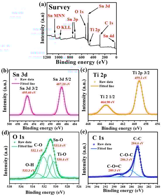 Figure 2 shows the XPS spectra of the as-synthesized Sn-TiO2-C (20 wt%). The survey spectrum confirmed the presence of Sn, Ti, O, and C in the sample (Figure 2a). In the high-resolution Sn 3d spectrum, the fitted peaks at 487.2 and 495.6 eV corresponded to Sn 3d3/2 and Sn 3d5/2, respectively. The peak splitting of 8.4 eV in the Sn 3d spectrum indicated the presence of Sn (Figure 2b), which was consistent with the XRD results (Figure 1a) [36]. The peaks at 464.9 and 459.2 eV with orbital splitting of 5.7 eV in the Ti 2p spectrum corresponded to Ti 2p1/2 and Ti 2p3/2, respectively, and the presence of TiO2 in Sn-TiO2-C (20 wt%) (Figure 2c). In the O 1s spectrum, the deconvoluted peaks at 530.4, 531, 532.1, and 533.3 eV corresponded to the Ti-O, Sn-O, C-O, and O-H functional groups, respectively (Figure 2d). The deconvoluted peaks at 284.6, 286.3, and 289.3 eV in the C 1s spectrum corresponded to C-C, C-O-C and C-O=C, respectively, in Sn-TiO2-C (20 wt%) (Figure 2e). Comparing the XPS spectra of Sn-TiO2-C (20 wt%) with those of Sn-TiO2 (Figure S7) revealed that most peaks were identical, except for the C 1s spectrum, where the intensities of the C-O-C and C-O=C peaks were significantly reduced owing to the absence of TiO2-C in Sn-TiO2.
