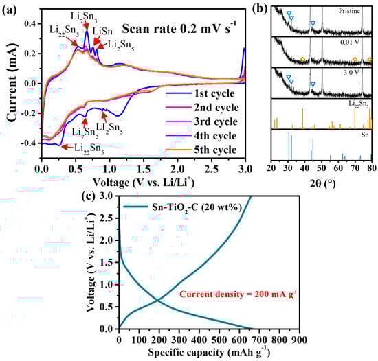 The electrochemical reaction mechanism of Sn-TiO2-C (20 wt%) was studied using CV, voltage profiles, and ex situ XRD. Figure 3a presents the CV profile of Sn-TiO2-C (20 wt%) obtained at a voltage scan rate of 0.2 mV s−1 for the first five cycles. During the first discharging cycle, three typical lithiation processes of the main active material Sn proceeded at ~0.89 V (2Li+ + 2e− + 5Sn → Li2Sn5), ~0.63 V (31Li+ + 2Li2Sn5 + 31e− → 5Li7Sn2), and ~0.27 V (9Li+ + 5Li7Sn2 + 9e− → 2Li22Sn5). The peak observed at ~1.2 V was attributed to the partial electrolyte decomposition catalyzed by Sn [12,37,38]. A broad peak close to ~0 V indicated the lithiation of C and the formation of a solid–electrolyte interphase (SEI). During the first charge cycle, a series of intermediate products were observed: Li22Sn5, Li7Sn3, LiSn, and Li2Sn5. The oxidation peak at ~1.2 V was related to the delithiation of Li-C [39]. These electrochemical reactions well-matched the capacity plateaus in the voltage profile shown in Figure 3b. In the ex situ XRD analysis (Figure 3c), only Li22Sn5 was detected as the main lithiation product in the fully discharged state. Notably, no other lithiation products were observed, probably because of their small amounts and surface amorphization during lithiation [40]. In the fully charged state, the active Sn peaks clearly reemerged, indicating reversible crystalline evolution of the active material during cycling. After the first cycle, the discharge and charge peaks were broader and smaller, but the peak intensities and positions remained almost unchanged, indicating reversible reactions of Sn-TiO2-C (20 wt%).