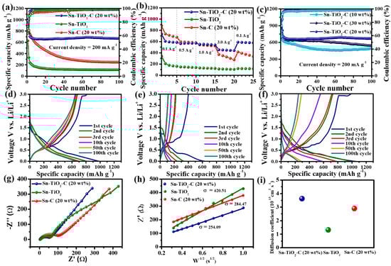 (a) Cycle performance (at 200 mA g−1); (b) rate performance (0.1−3.0 A g−1) of Sn-C (20 wt%), Sn-TiO2, and Sn-TiO2-C (20 wt%); (c) cycle performance of Sn-TiO2-C (10 wt%), Sn-TiO2-C (20 wt%), and Sn-TiO2-C (30 wt%) at 200 mA g−1; voltage profiles of (d) Sn-C (20 wt%), (e) Sn-TiO2, and (f) Sn-TiO2-C (20 wt%) at 200 mA g−1; (g) Nyquist plot and (h) fitting plot of Z’ vs. W−1/2; (i) diffusion coefficients of Sn-C (20 wt%), Sn-TiO2, and Sn-TiO2-C (20 wt%).