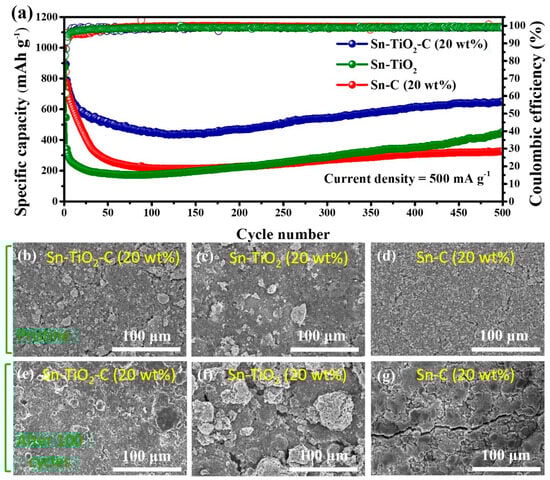 (a) Cycle performance of Sn-TiO2-C (20 wt%), Sn-TiO2, and Sn-C (20 wt%) at 500 mA g−1. SEM images of (b,e) Sn-TiO2-C (20 wt%), (c,f) Sn-TiO2, and (d,g) Sn-C (20 wt%); (b–d) pristine and (e–g) after 100 cycles (applied current density of 500 mA g−1).