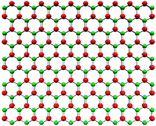 Hexagonal boron nitride (h-BN) nanosheet. The B atoms are shown in red; the N atoms are in green.