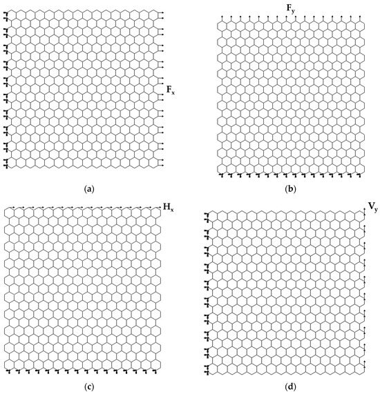 In the first loading case, shown in Figure 3a, the nodes of the left side of the BNNS were fixed, while an axial tensile force, , was applied to the right (opposite) side. In the second case, the BNNS bottom side was fixed, and an axial force, , was applied to the upper side nodes (see, Figure 3b). In the third loading case, represented in Figure 3c, the boundary conditions were the same as in the second case, while a shear force, , was applied on the nodes of the upper side of the BNNS. In the fourth case, the boundary conditions were the same as in the first case, and a shear force, , was applied to the edge nodes on the BNNS right side (see, Figure 3d). Therefore, according to the atomic arrangement of the nanosheet or nanoribbon along the horizontal and vertical directions, the zigzag and armchair configurations, respectively, of the BNNS (BNNR) are considered.