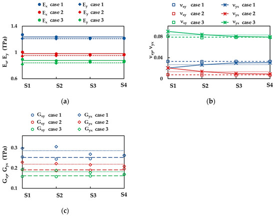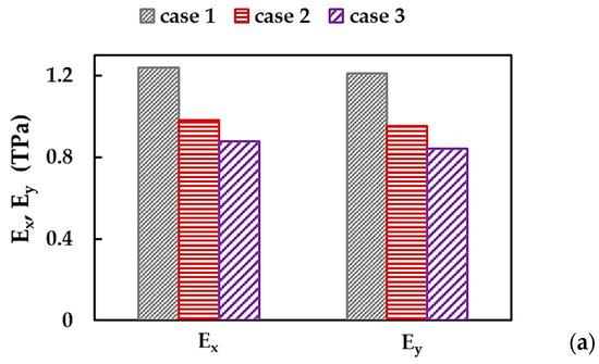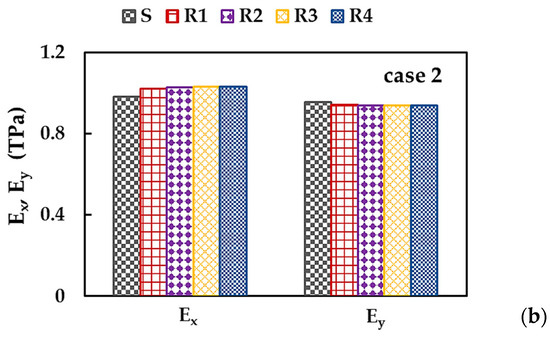 Figure 5a shows the Young’s moduli along x-direction (zigzag), , and y-direction (armchair), , calculated by Equations (10) and (12), respectively, for the BN square nanosheets of different sizes (see Table 1), taking into consideration the three cases of input parameters for numerical simulation presented in Table 2. Both and moduli are nearly constant for all sizes of BNNSs studied—except the Young’s modulus for zigzag configuration, , of the smallest nanosheet S1, for which a slight increase in the value of is observed—in the case 1, 2, and 3, of the input parameters. The average values of Young’s moduli, and , represented in Figure 5a by solid and dashed lines, respectively, are considered in further analysis.