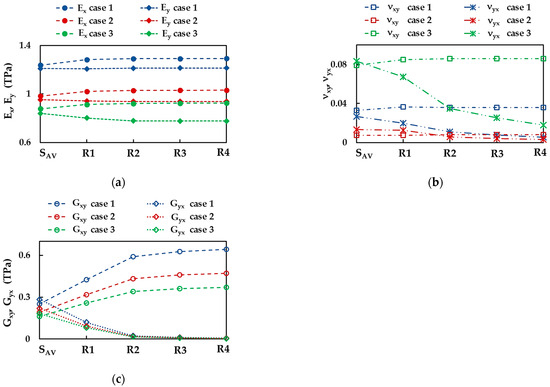 The average values of the Young’s, and , and shear, and , moduli, and the Poisson’s ratio, and , are summarized in Table 3 for the three cases of the input parameters.