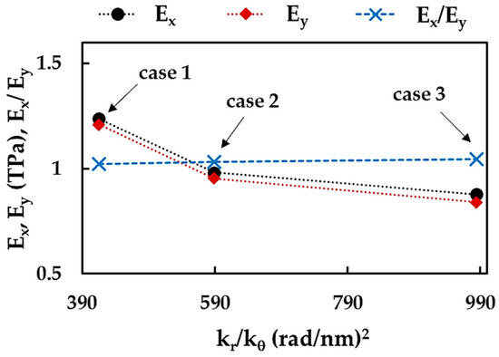To clarify the influence of the numerical simulation input parameters on the Young’s moduli of the BNNSs—along the zigzag and armchair directions, and their relationship, the values of , and /—were plotted in Figure 9 as a function of the ratio between the bond stretching and bond bending force constants, /. The ratio, /, was chosen for this purpose because it is required to calculate the input parameters (see Equation (8)). The Young’s moduli, and , decrease with the increase of the / ratio, and the greatest decreasing rate is observed when moving from case 1 to case 2. The ratio between the Young’s moduli / increases with the increase of /, viz. from case 1 to 3.