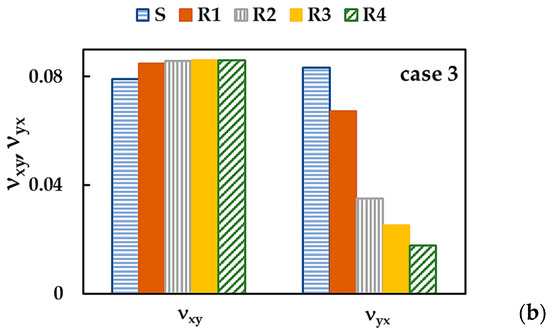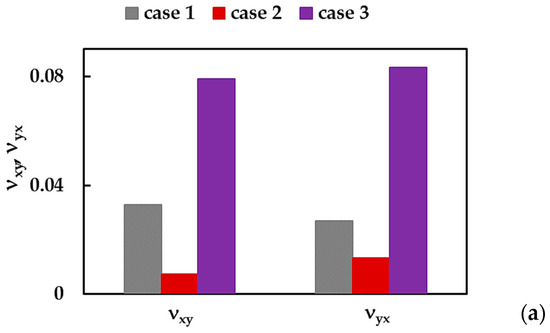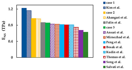 The values of the Poisson’s ratio, , in Table 6 show considerable scattering in the range of 0.211 [21] to 0.822 [39]. Among the studies mentioned in Table 6, Le and Nguyen [37] and Georgantzinos et al. [38], in addition to the value, reported another Poisson’s ratio, , with a ratio ≈ 1.018 and 1.005, respectively. These values indicate that is slightly higher than , unlike the current study in which is 1.22 (case 1), 0.55 (case 2), and 0.95 (case 3). It is worth noting that the values of and , assessed by Georgantzinos et al. [38], are averages obtained for square and rectangular BNNSs in a wide range of their aspect ratio.