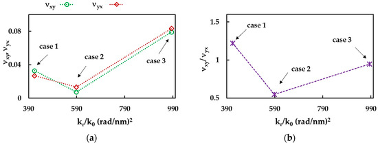 To study the influence of the input parameters, the Poisson’s ratios, and , and their relationship, /, for the BNNSs were plotted as a function of the ratio between the force constants, /, in Figure 12a,b. All values, , , and /, decrease with the increase in the ratio /, from case 1 to case 2, and then increase with further increase in / for case 3. This behavior indicates the dependence of the Poisson’s ratio of the BNNSs on the values of the input parameters, rather than being dependent on the NS anisotropy.