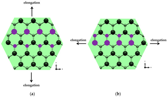 The difference between the Young’s moduli ( > ) of the BNNSs can be explained by dissimilar stresses necessary for the contraction of the hexagonal NSs in the zigzag and armchair directions, which occur under longitudinal and transversal loads, respectively, as schematically illustrated in Figure 13.
