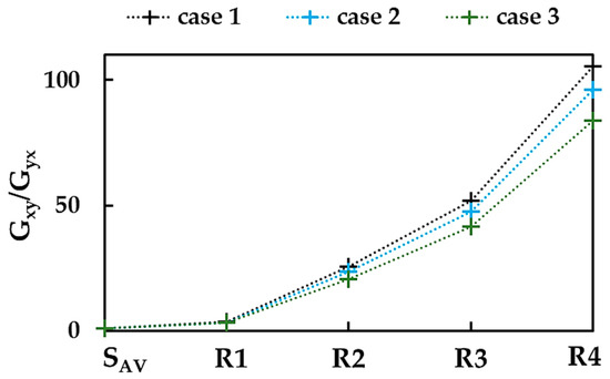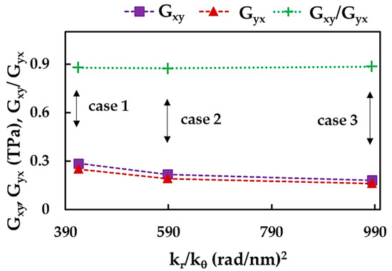 The results shown in Figure 16 can be better understood by analyzing the bending force constant, . Indeed, the shear moduli, and , decrease from case 1 to case 3, with a decreasing value of , (see, Table 2).