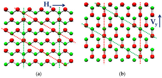 Exemplification of the shear behavior of BNNSs in the plane of hexagonal lattices under (a) horizontal loading and (b) vertical loading. The B atoms are shown in red; the N atoms are in green. The dashed lines are plotted to facilitate the perception of the relative atomic positions.
