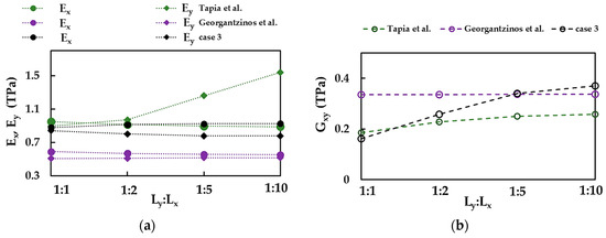 Comparison of the current values of (a) Young’s moduli, and , and (b) shear modulus, , for case 3, with those by Georgantzinos et al. [38] and Tapia et al. [39].