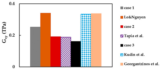 In Figure 21, the BNNS shear modulus evaluated by Kudin et al. [21], Le and Nguyen [37], and Georgantzinos et al. [38] have comparable values of about 0.339 TPa, despite dissimilar modeling approaches used—ab initio DFT [21], NCM/MSM employing 2-node stretching and 3-node angle bending [37], and spring elements [38]—to represent B–N bond. The value of assessed in the abovementioned studies are higher than those of the current work (cases 1, 2, and 3) and Tapia et al. [39]. This smoother shear response and lower value of , observed in the current work and in that of Tapia et al. [39], can be possibly justified by the elastic element formulation, i.e., beam elements were used for modeling the B–N bond in both studies. The 2-node stretching and 3-node angle bending elements, which form the global stiffness matrix and the springs utilized in the works of Le and Nguyen [37] and Georgantzinos et al. [38], respectively, have a smaller number of degrees of freedom and consequently are stiffer. This may be a conceivable explanation for the higher shear modulus values found in the abovementioned studies [37,38]. To the best of our knowledge, among the existing works, only Georgantzinos et al. [38] reported the shear modulus for both orientations, and ,. Their ratio is about 0.98, which is higher than the current ratio / ≈ 0.88.