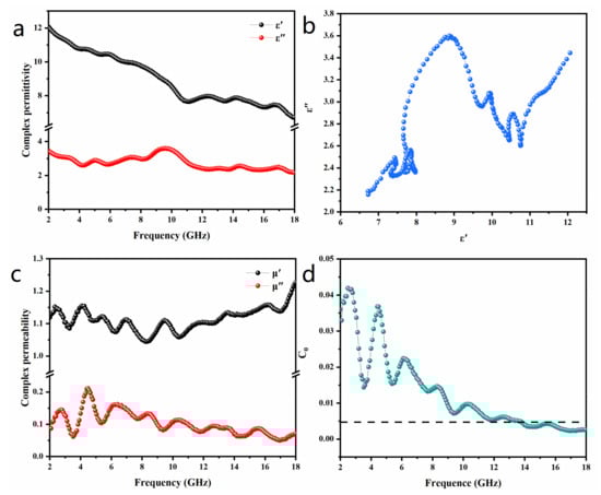 The complex permittivity (a), Cole–Cole curve (b), complex permeability (c), and C0 curve (d) of the paraffin-based composite with 30 wt. % (Ni@NO-C)n/NO-C.