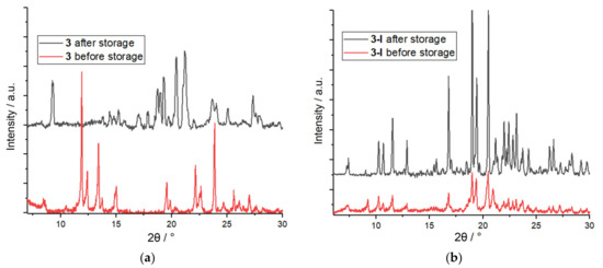 PXRD patterns of 3 (a) and 3-I (b) after six months of storage.