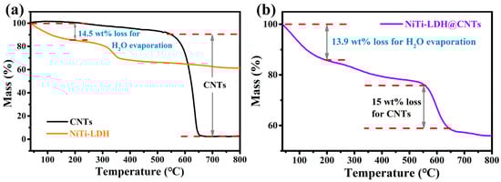 Thermogravimetric analyses were conducted on NiTi-LDH, CNTs, and NiTi-LDH@CNTs, and the results are presented in Figure 2. The water contents for the NiTi-LDH and NiTi-LDH@CNTs are determined by the mass loss at 200 °C to be 14.5 wt% and 13.9 wt%, respectively [20]. The weight loss at around 350 °C for the NiTi-LDH is attributed to the removal of the hydroxyl group on the NiTi-LDH layer plate, as well as the interlayer cyanate and carbonate anions [31]. The content of CNTs in the NiTi-LDH@CNT composite was calculated by the mass loss in the temperature range of 550–650 °C to be approximately 15 wt%. The carbon content is consistent with the result obtained from the elemental analysis (Table S1).