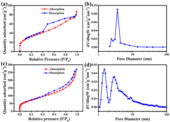 Nitrogen adsorption/desorption isotherms and the corresponding pore size distributions of as-prepared of (a,b) NiTi-LDH and (c,d) NiTi-LDH@CNT materials.