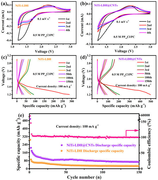 The Cl¯ ion storage performance of NiTi-LDH and NiTi-LDH@CNTs were investigated with LiCl/Li as anode and 0.5 mol L−1 PP14Cl/PC as electrolyte. LiCl/Li anode was prepared by fully discharging the assembled Li‖FeOCl coin cell. During this process, Cl ions migrate from FeOCl throughout the electrolyte to the metallic Li and react with the metallic Li to form LiCl. Since metallic Li is in excess, the LiCl/Li anode was therefore obtained. Figure S2 displays XRD and EDS maps of the as-prepared FeOCl, which are in agreement with our previous reports [16,32]. Moreover, Figure S3 displays the flower-like morphology of FeOCl. The successful preparation of LiCl/Li anode was confirmed by the XRD pattern as displayed in Figure S4b. Figure 5a,b depicts the CV curves of NiTi-LDH and NiTi-LDH@CNT electrodes in the voltage range of 1.2–3 V at 100 mA g−1. The CV curves of both electrodes exhibit an almost rectangular shape with no obvious redox peaks, implying a dominant capacitive storage mechanism [33]. The oxidation peak at 2.3 V corresponds to Cl− entering the LDH interlayer, and the reduction peak at 1.4 V corresponds to Cl− coming out of the LDH interlayer. Consistent with the CV curves, the galvanostatic charge and discharge curves for both electrodes (Figure 5c,d) displayed no obvious charge–discharge plateaus. The initial discharge specific capacity for NiTi-LDH and NiTi-LDH@CNT composites are 288 mAh g−1 and 498 mAh g−1, respectively. The addition of CNTs in the composites resulted in a higher reversible specific capacity of 69 mAh g−1 after 150 cycles, compared to 28 mAh g−1 of pure NiTi-LDH (Figure 5e). The NiTi-LDH@CNT electrode has a larger specific surface area and higher electronic conductivity, which makes it render a higher discharge capacity. In addition, the rapid capacity decay during the first 20 cycles for the NiTi-LDH@CNT electrode may be ascribed to its large surface area, which facilitates the formation of more SEI layer due to the increased side reaction with the electrolyte during continuous cycling. Furthermore, Coulombic efficiency of NiTi-LDH@CNT electrodes can reach 99%. It is worth noting that the capacity contribution from CNTs can be negligible (Figure S5).