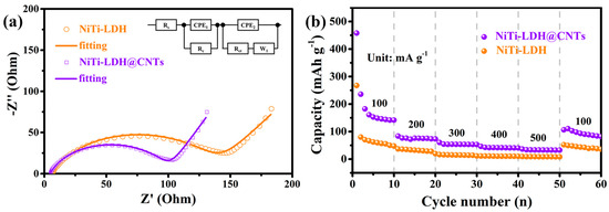 The rate performance of pure NiTi-LDH and NiTi-LDH@CNT electrodes were further studied. As shown in Figure 6b, the reversible specific capacities of NiTi-LDH@CNT composites at 100, 200, 300, 400 and 500 mA g−1 are 191, 74, 54, 42 and 33 mAh g−1, respectively, which are higher than 81, 31, 15, 11 and 9 mAh g−1 of pure NiTi-LDH. When the current density returns to 100 mA g−1 again, the average discharge specific capacity of the NiTi-LDH@CNT cathode is 94 mAh g−1, while the average discharge specific capacity of pure NiTi-LDH is 43 mAh g−1. The enhancement of rate performance for the NiTi-LDH@CNT cathode could be attributed to the improved conductivity caused by the introduction of carbon nanotubes.