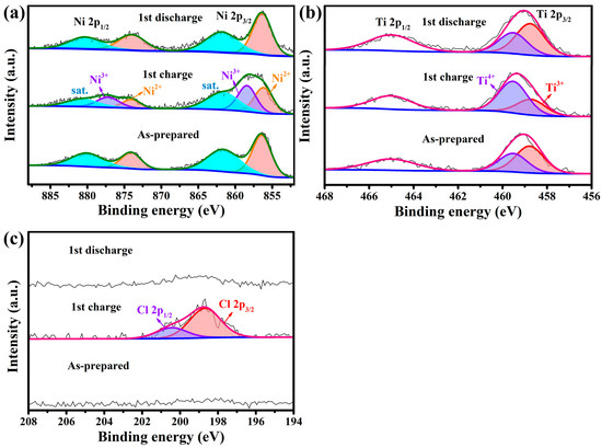 X-ray photoelectron spectra (XPS) were performed to investigate the chlorine storage mechanism during the charging and discharging process of NiTi-LDH@CNT composite electrodes. In Figure 7a, a distinct pair of Ni 2p1/2 and Ni 2p3/2 peaks in the Ni 2p XPS spectrum of the as-prepared electrode appeared, along with the satellite peaks at 880.4 eV and 861.8 eV. [20,22]. Upon charging, a new Ni 2p peak doublet located at higher binding energies of 877.1 and 858.4 eV emerged, which can be assigned to Ni3+ species [27,34,35,36]. Upon the following discharge, the Ni 2p signals belonging to the Ni3+ species disappeared. In Figure 7b, two pairs of distinct Ti 2p1/2 and Ti 2p3/2 peaks are visible in the Ti 2p XPS spectrum. Deconvolution peaks of Ti 2p3/2 at 459.5 eV and 458.7 eV are assigned to Ti4+ and Ti3+ states, respectively [24]. During the charging process, the signals of Ti4+ intensified while the signals of Ti3+ weakened, indicating that the average valence of Ti increased [37,38]. During the discharging process, the relative intensity of Ti3+ and Ti4+ signals were restored to the original state. In Figure 7c, the Cl 2p peak doublet at 198.7 (Cl 2p3/2) and 200.5 eV (Cl 2p1/2) came out during the charge process, providing proof for the Cl¯ entering the LDH layer [16,39]. The reversal of this change demonstrates the excellent oxidation/reduction reversibility of NiTi-LDH@CNTs as a CIB cathode material.