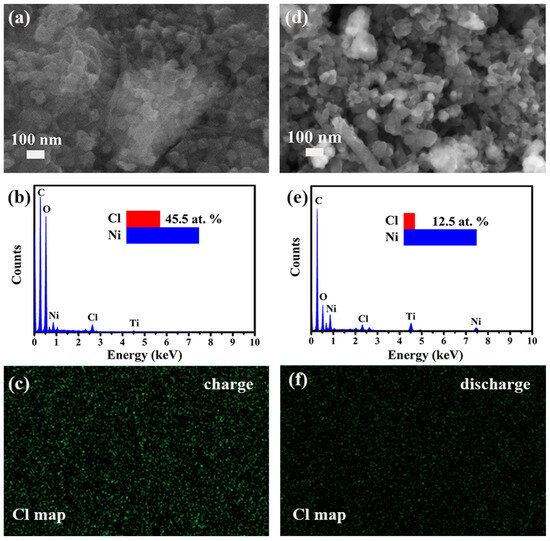 FE-SEM images and the corresponding EDS results of the NiTi-LDH@CNT cathodes: (a–c) 10th charge and (d–f) 10th discharge. The inset in (b,e) is the atomic ratio of Cl/Ni.