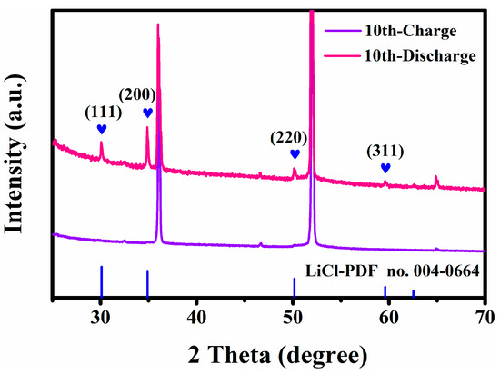 In addition, we have conducted ex-situ XRD studies on the anode side during the 10th cycle and the results are presented in Figure 9. Upon fully charging to 3 V, the characteristic diffraction peak of LiCl disappeared, indicating the release of Cl¯ from Li metal [20]. Upon fully discharging to 1.2 V, the characteristic diffraction peak of LiCl appeared, signifying the migration of Cl¯ back to the anode side to form LiCl. These findings confirm the reversible shuttle of chloride ions between cathode and anode.