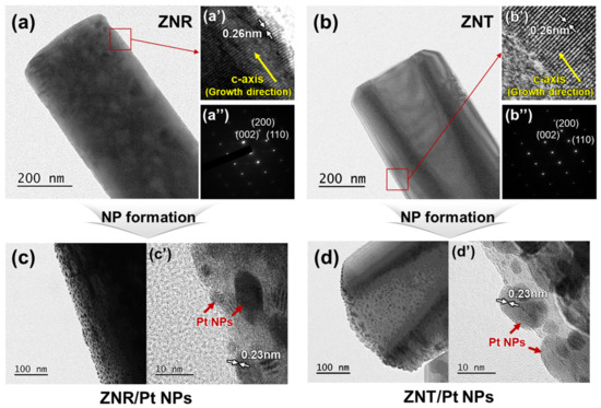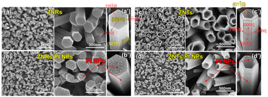 Figure 2a shows the FE-SEM images of the hexagonal ZNR arrays synthesized using the hydrothermal method. The diameters of the ZNRs were within the range of 150–550 nm, and the height of the ZNRs was approximately 1.4 μm. As shown in Figure 2a′, the ZnO (0001) plane was formed on the tops of the ZNRs, and the ZnO (10-10) and (01-10) planes were formed on their sidewalls. After Pt layer deposition on the ZNRs and annealing at 600 °C (Figure 2b), Pt NPs formed on the surface because the as-deposited Pt nano-layer is generally metastable and transforms into an energetically stable droplet form even at a temperature below its melting point [32,33]. As shown in Figure 2b′, the top and sidewalls of the ZNRs were covered with Pt NPs. Figure 2c shows the ZNTs obtained after the selective wet etching of the ZNRs. Hexagonal holes formed in the upper parts of the ZNTs, resulting in the formation of ZNT walls with a thickness of approximately 40 nm. The inner planes of the walls belonged to the {01-10} family of hexagonal planes (Figure 2c′). Figure 2d shows the ZNTs covered with Pt NPs, which were formed using the same process as the ZNRs/Pt NPs (Figure 2b). Pt NPs formed on the top, outer, and inner planes of the ZNTs (Figure 2d′). In addition, the energy-dispersive X-ray spectroscopy results confirmed that the ZNR/Pt NP and ZNT/Pt NP samples were composed of ZnO and Pt (Figure S3).