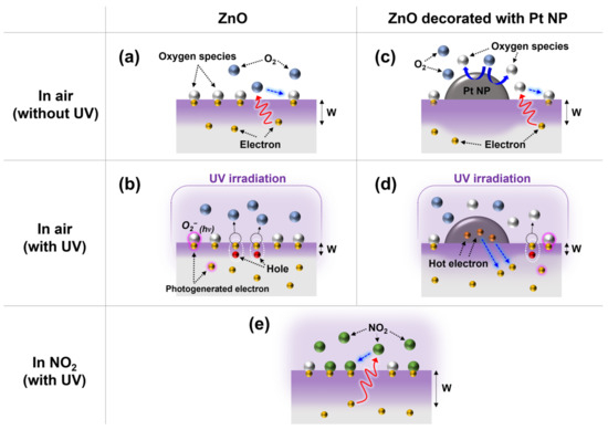 Figure 6 shows the NO2-sensing mechanism of the ZnO gas sensors under UV irradiation. Figure 6a,b show the surface reactions of ZnO without Pt NPs. As shown in Figure 6a, when the ZnO gas sensors were exposed to atmospheric air, the electrons in the conduction band of ZnO were transferred to the adsorbed oxygen atoms. Subsequently, oxygen species were chemisorbed onto the ZnO surface.