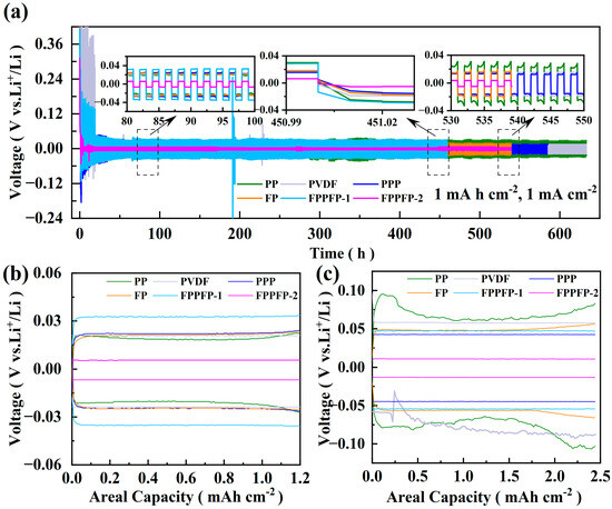 The possible effects on Li plating/stripping (1 mAh cm−2, 1 mA cm−2; 2 mAh cm−2, 2 mA cm−2) from the Fe3O4-PVDF composite network are demonstrated (Figure 2). The FPPFP-2 (Fe3O4-PVDF/PVDF/Fe3O4-PVDF), PVDF, PPP (PVDF/PP/PVDF), FP (Fe3O4-PVDF), and FPPFP-1 (Fe3O4-PVDF/PP/Fe3O4-PVDF) with and without the network can be synchronously compared. With the voltage hysteresis value of the constant current in discharge and charge curves, we can judge the effect of different structures in the long cycle process [30]. As shown in Figure 2, FPPFP-2 exhibits smaller post-voltage and cycle stability compared with others. The cycling performance of symmetrical cells under the conditions of 1 mA cm−2 current density and 1 mAh cm−2 lithium deposition/desolvation is shown in Figure 2a.