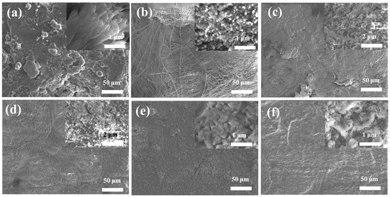 Figure 3 presents the surface morphology of the lithium anode subjected to 250 cycles, both with and without the Fe3O4-PVDF composite network at a current density of 1 mA cm−2 and a capacity of 1 mAh cm−2. As shown in Figure 3a, it can be observed that there is vigorous growth of bulky dendrites, which form the terrace structure and the surface structure of the lithium metal electrode without the Fe3O4-PVDF composite network. Dendrites of the PVDF and PPP (Figure 3b,c) are clustered, forming dense strips with a few regions of reduction on the electrode surface. Upon introducing Fe3O4, fine lithium particles emerge on the surface of the FP, FPPFP-1, and FPPFP-2 electrodes, creating localized unevenness on the Li surface. It can be seen that the lithium surface displays a significant improvement compared to the PVDF and PPP samples without the composite network. Notably, the FPPFP-1 and FPPFP-2 electrodes consistently maintain a good surface morphology throughout the cycling, exhibiting minimal dendrite formation relative to the FP (Figure 3e,f). The above analysis of the lithium anode’s surface morphology reveals that the electrospun PVDF network effectively inhibits the formation of bulky dendrites. Furthermore, the Fe3O4-PVDF composite network facilitates uniform lithium deposition while maintaining the integrity of the electrode structure.