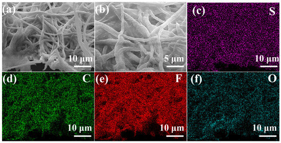 To clarify whether lithium is deposited at unintended locations on or within the Fe3O4-PVDF composite network film, Li deposition in Li-Li symmetric cells was conducted under the conditions of 1 mA cm−2 current density and 1 mAh cm−2 lithium deposition/desolvation. After cycling, SEM images of the cross-section of FPPFP-2 post-lithium plating and the corresponding SEM-EDX oxygen signal mapping were tested (Figure 4). From Figure 4a,b, it can be seen that the post-lithium plating network is integrated and smooth, which will provide a feasible environment for Li deposition. Figure 4c–f show the SEM-EDX results of carbon, fluorine, sulfur, and oxygen. The carbon and fluorine elements come from the PVDF, and sulfur comes from the electrolyte. Oxygen mapping is similar to that of carbon and fluorine. Oxygen is about 6.4 wt.% (Figure S5), indicating limited lithium located on the Fe3O4-PVDF composite network film.