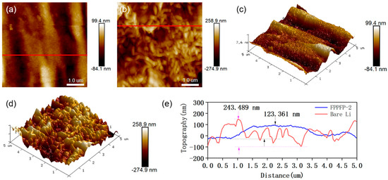 AFM test for the PP and FPPFP-2 electrodes after 250 cycles at a current density of 1 mA cm−2 and a capacity of 1 mAh cm−2. (a,b) Planar AFM images for the PP and FPPFP-2 electrodes; (c,d) 3D AFM images of the PP and FPPFP-2 electrodes; (e) height difference of the PP and FPPFP-2 electrodes.